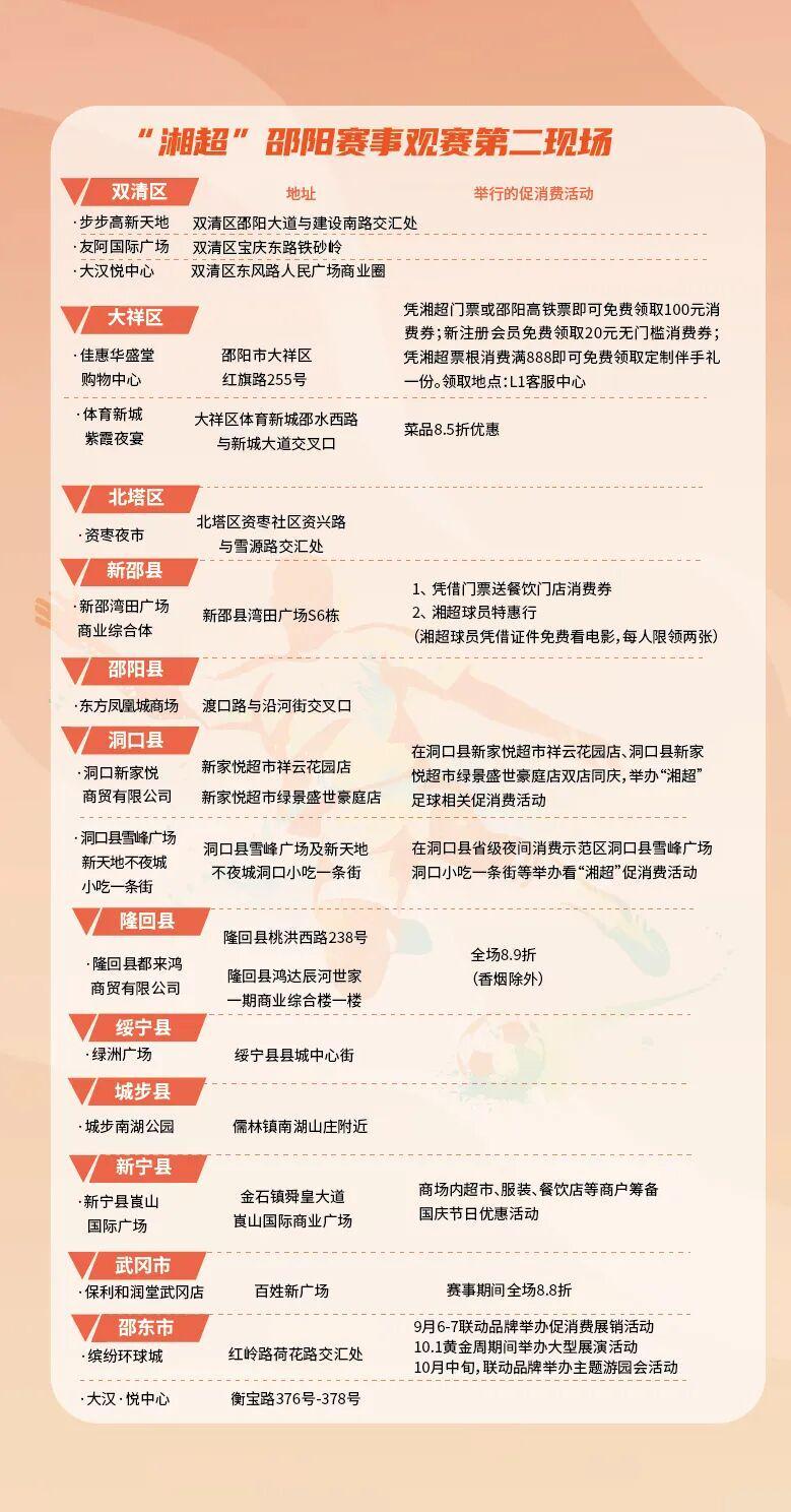 “‘湘’约邵阳‘超’级精彩”“邵阳商超嗨购嘉年华”“赛事票根逛邵阳”“平台线上惠民补贴”等多个主题活动,将赛事激情延伸至场外。